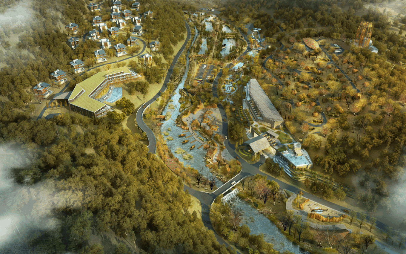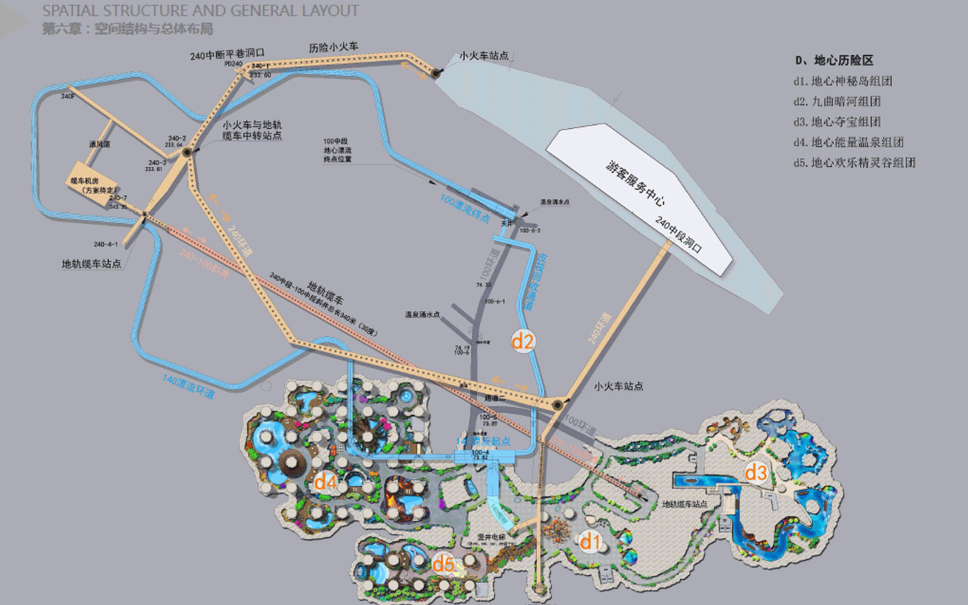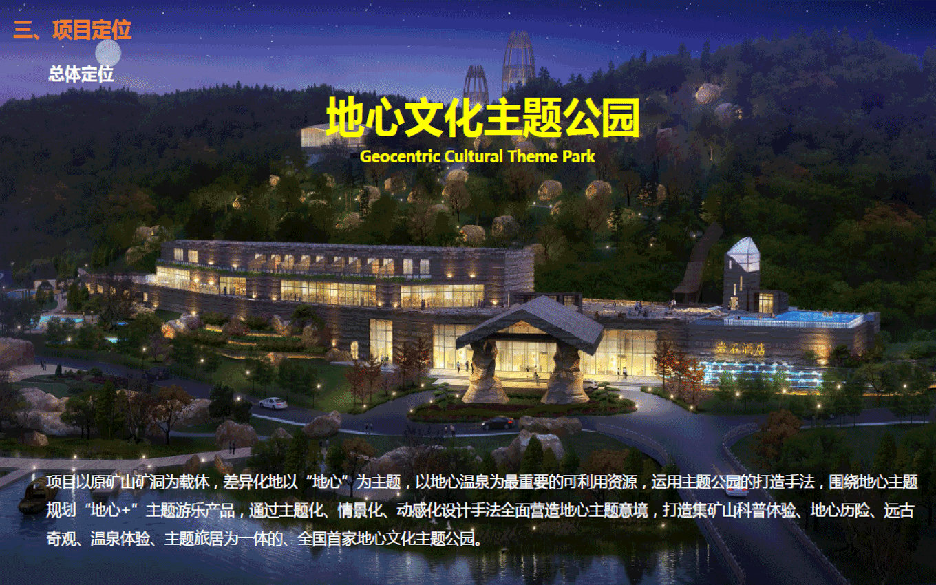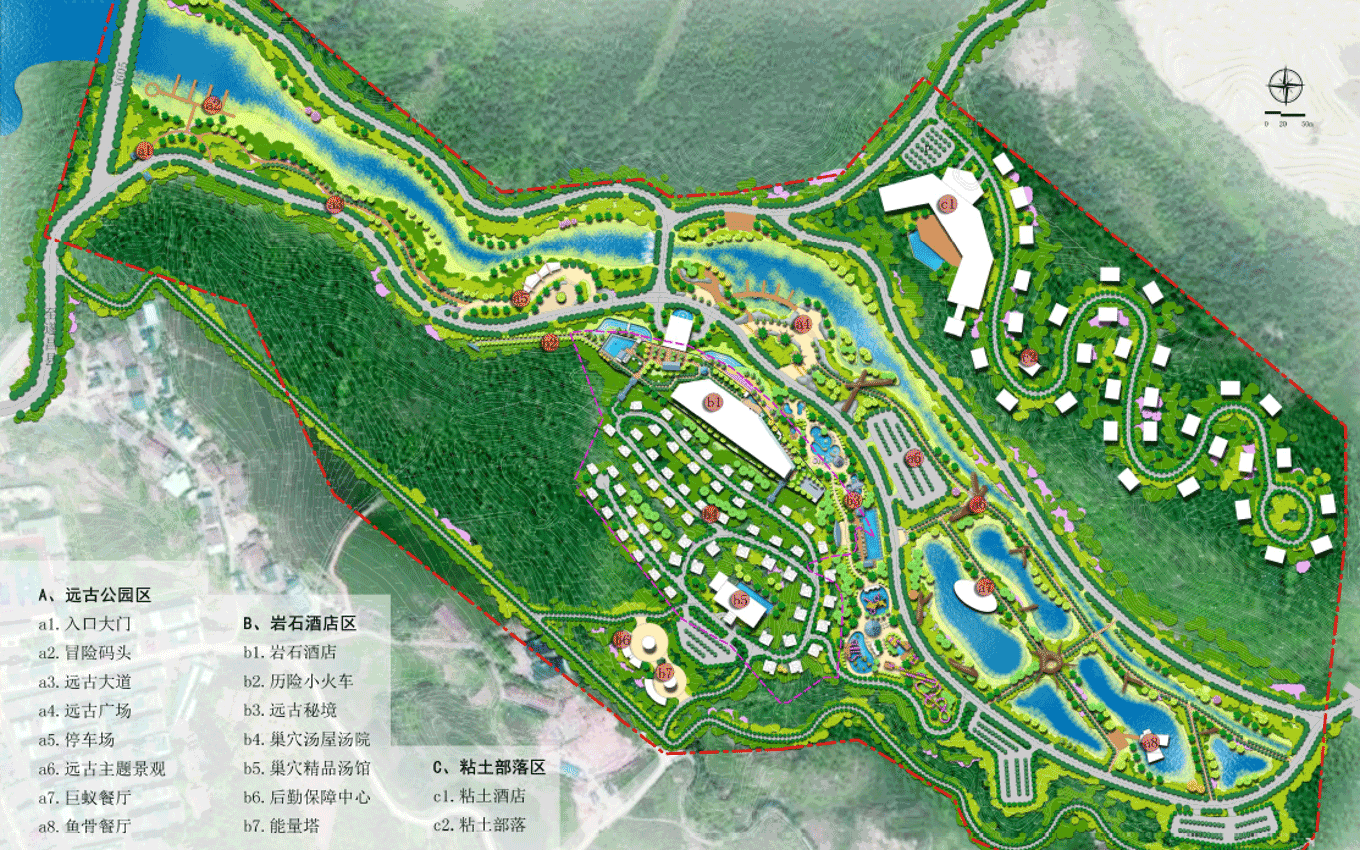 遠古公園景區(qū),位于規(guī)劃區(qū)中部,為東西走向的兩山相夾谷地地形東部直接連接605縣道,西部與農(nóng)田相接。絕大部分為原礦山尾水排放區(qū)域,業(yè)主方要求打造成濕地公園遠古公園度假景區(qū)功能定位,景區(qū)形象展示、停車服務(wù)、休閑公園、污水凈化、主題餐飲。目標市場為家庭游和主題游樂客群;策劃理念是利用交通對接便利的條件,展示地心公園主題形象和主題景觀,配建停車、餐飲等配套服務(wù)功能,遠古公園以遠古濕地為形態(tài),以遠古荒蕪為景觀風(fēng)格,實現(xiàn)遠古公園與地心公園整體風(fēng)格的協(xié)調(diào)統(tǒng)一。