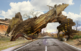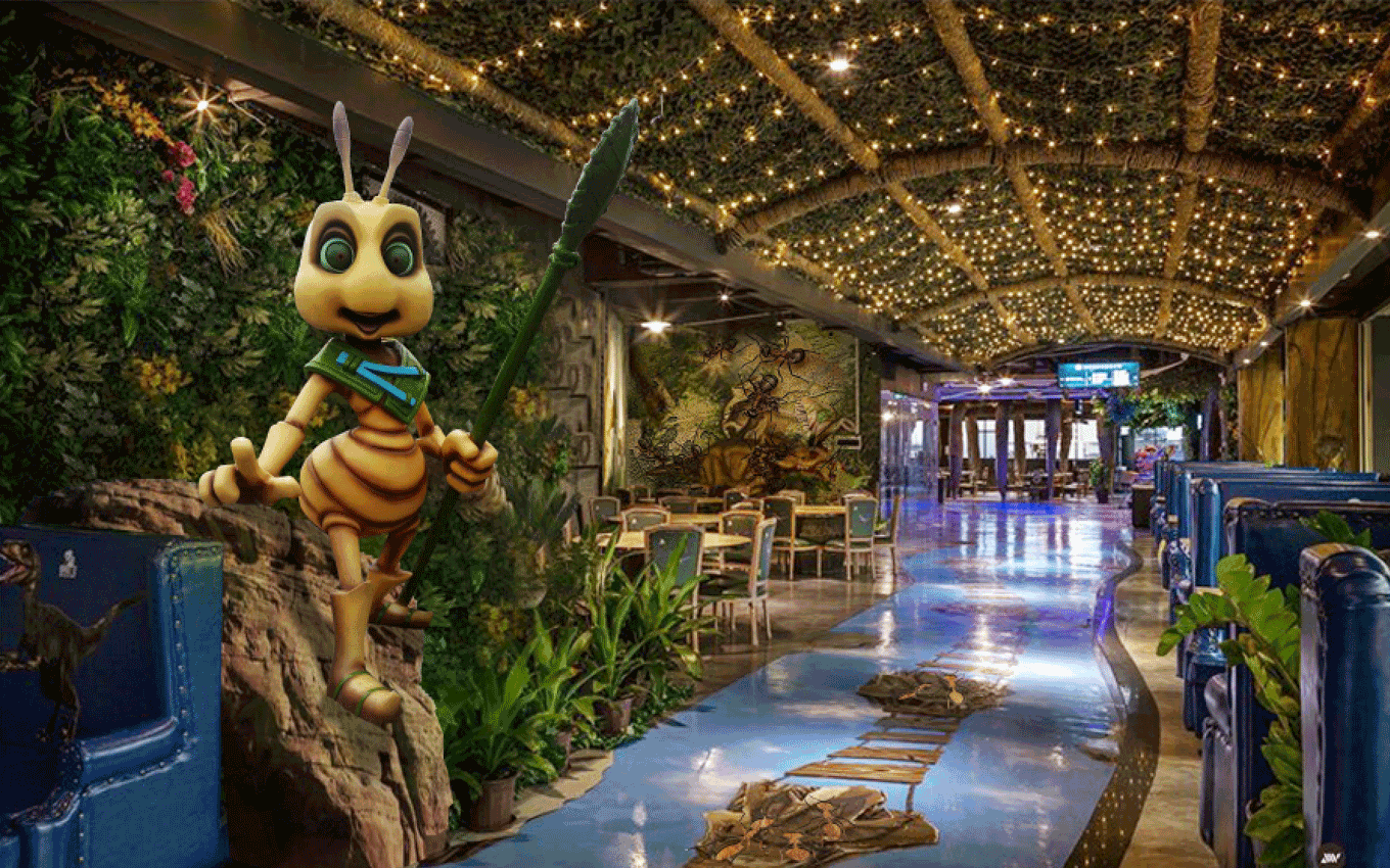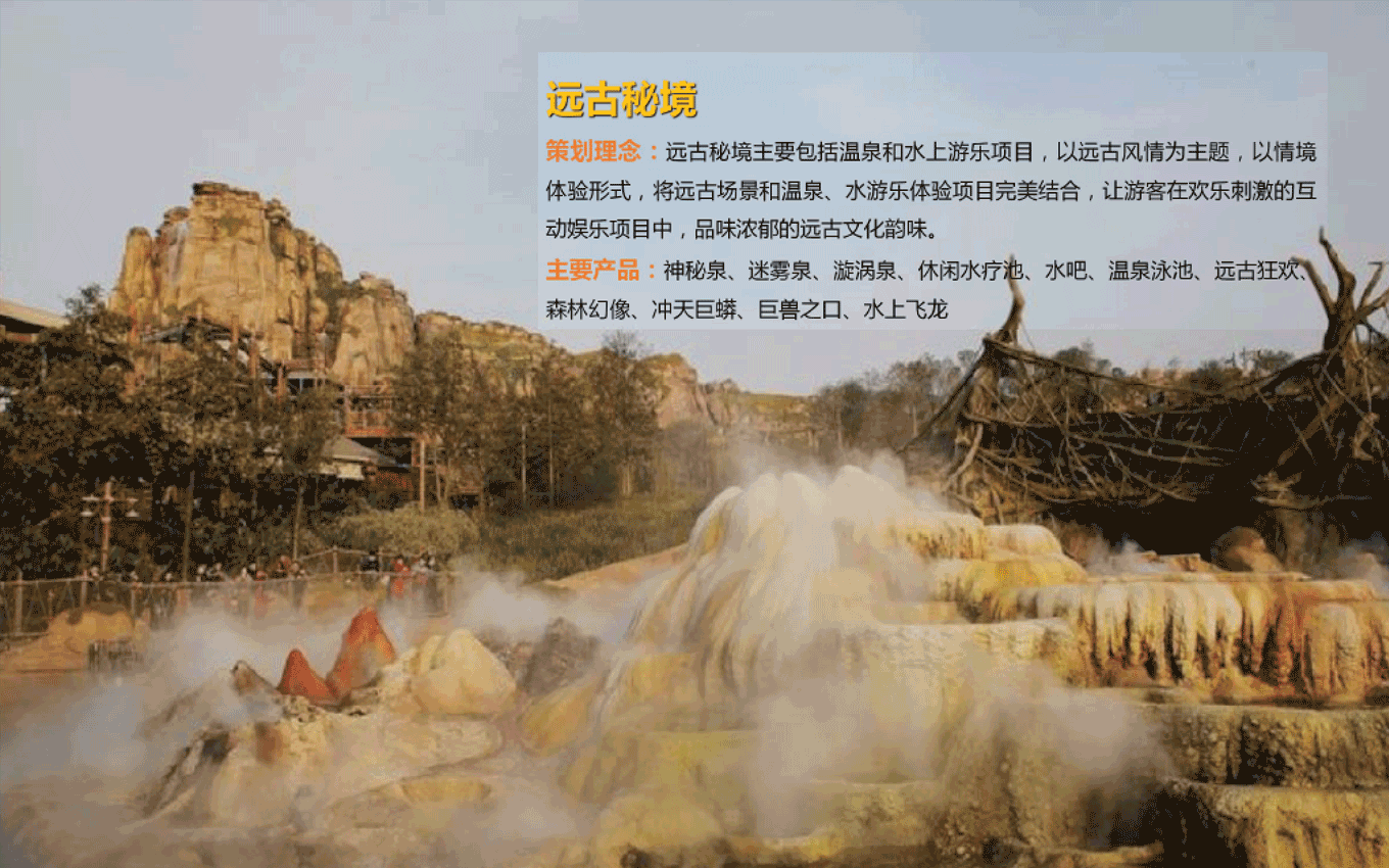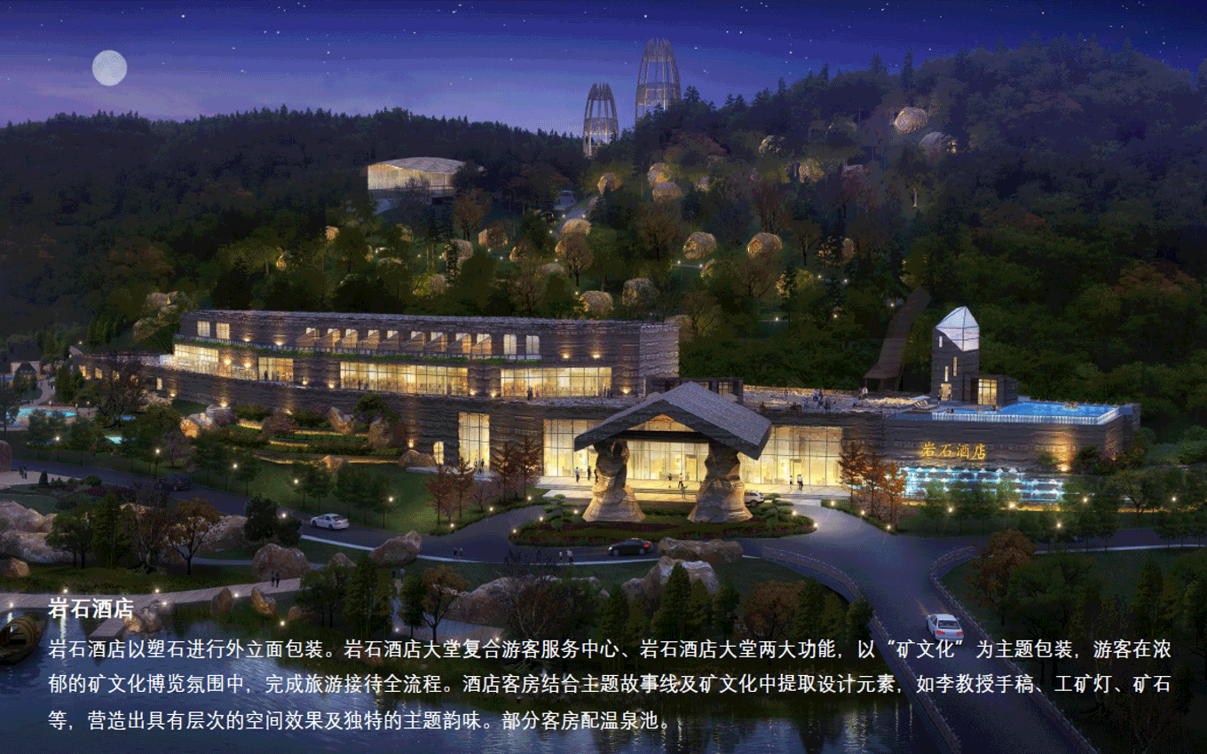 度假溫泉度假區(qū)入口大門/遠古大道/遠古廣場/遠古主題景觀圍繞地心文化主題,提取巨型動物化石、枯樹木、獸骨、蛛網(wǎng)、石堆、龍蛋及主題故事線中IP形象等元素進行主題包裝,營造遠古時期原始、神秘、荒蕪的主題場景,激發(fā)游客的好奇心,快速進入設(shè)定的的主題故事中。
