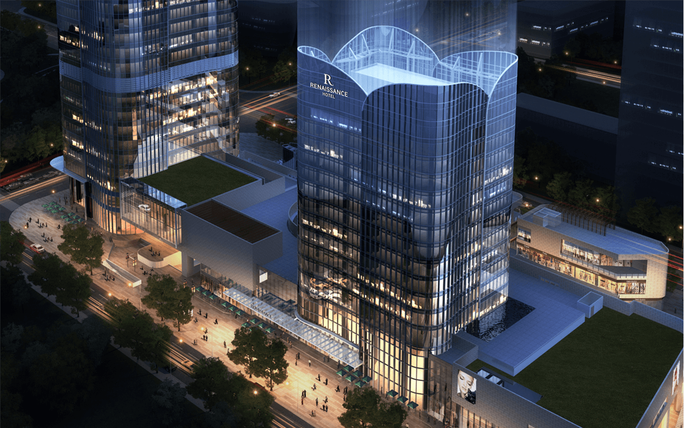 萬麗酒店總建筑面積:200653.85㎡,其中地上建筑面積122504.63㎡,包括1棟43層(79619.86㎡)的超高層國際5A甲級寫字樓(T1塔樓);1棟18層(33500㎡)的國際知名品牌酒店(T2塔樓);1棟獨(dú)棟及商業(yè)裙樓(7120.98㎡);五層地下室總建筑面積78149.22㎡,包含5000㎡的商業(yè)地下室,1216個機(jī)動停車位及設(shè)備用房。